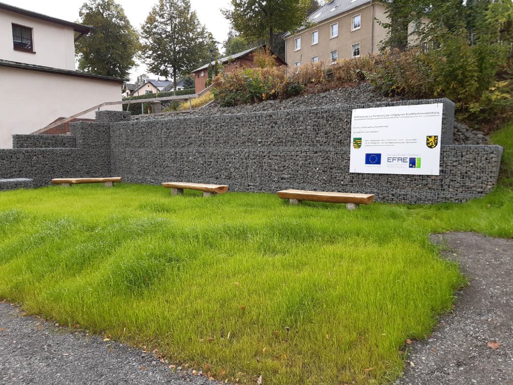 Im Rahmen der Integrierten Brachflächenentwicklung wurden der Kommune Fördermittel zum erstzlosen Rückbau der Gebäude und der anschließenden Gestaltung einer Grün- und Verweilfläche bewilligt. Das Gelände wurde sehr ansprechend gestaltet, für den gegenüberliegenden Kindergarten wurden PKW- Stellplätze geschaffen sowie Obstbäume und Sträucher gepflanzt, deren Früchte den Kindern hoffentlich zu gute kommen.